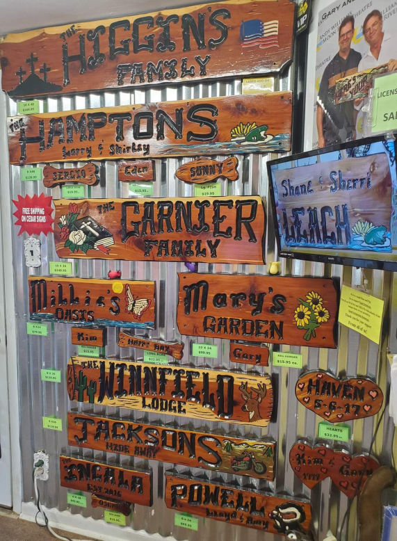 Our specialty is our custom cedar signs, which are made out of Ozark Red Cedar, we have a variety of sizes and shapes to suit your needs. Our signs are made by hand with only a marker and a hand held router. We ship our signs for free within the continental USA.