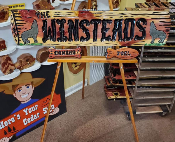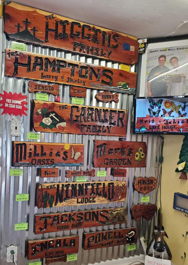 Our specialty is our custom cedar signs, which are made out of Ozark Red Cedar, we have a variety of sizes and shapes to suit your needs. Our signs are made by hand with only a marker and a hand held router. We ship our signs for free within the continental USA.